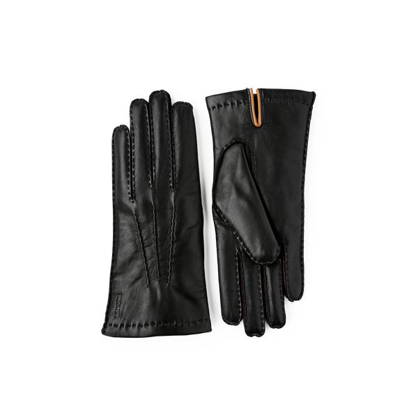 Stilren och elegant damhandske med sidenfoder. Sydd i finaste italiensk lammnappa, ett fantastiskt följsamt läder med hög glans. Passformen är handnära med halvpiqué-söm längs fingrarna. Sidenfodret värmer lätt med mjuk, lyxig känsla. En tidlös modeaccessoar för en sofistikerad vår- och höstlook.