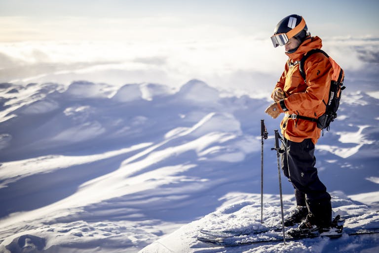 ”På sistone har jag åkt en del i Vertical Cut CZone och framför allt i Omni 5-finger. Hestra gör varmare modeller men jag är ganska varm om händerna, så för mig är det viktigaste att få rätta känslan. Jag har även använt Army Leather Tundra som är schyssta när man tar sig till och från backen eller håller på och grejar i snön. Men när jag åker föredrar jag korta muddar som smiter åt så att det inte blir så mycket överlapp. Man har ju underställ och mellanlager och skidjacka, så det är viktigt att det inte blir bylsigt där allting möts. Hellre låta jackan gå över handskarna än tvärtom. Sen om man fryser så finns det ju tunna liners som man kan ha under, och svinkalla dagar kör jag i Omni Mitt.”
