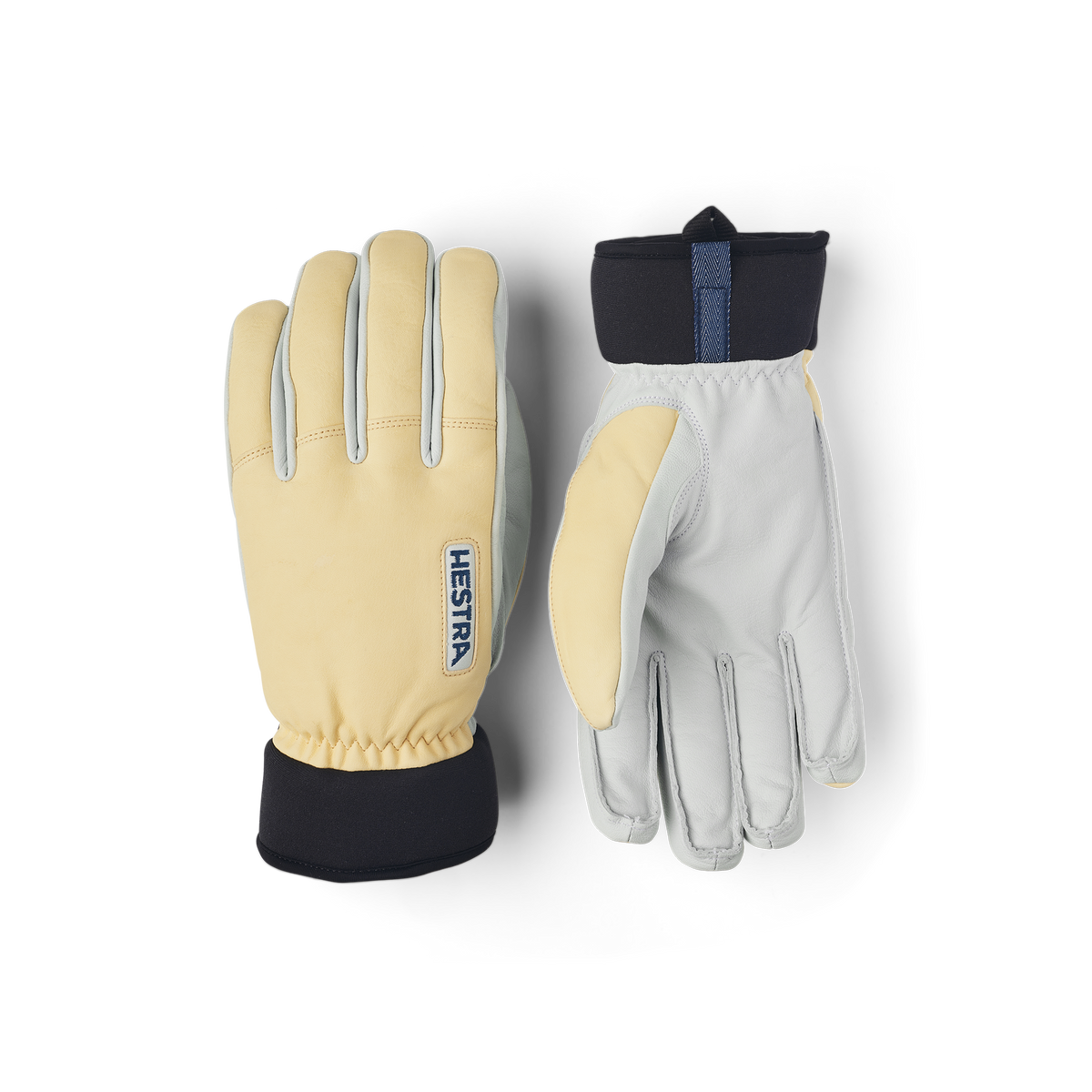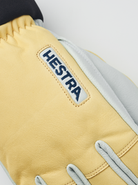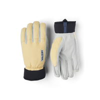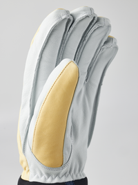Ljusgul skidhandske i getskinn och nötnappa med vit innerhand