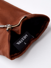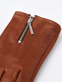 Kort, stilren damhandske i skinn med dekorativ dragkedja i metall på ovansidan. Sydd i följsam italiensk lammnappa med handnära passform. Ett lätt sidenfoder gör den perfekt f...